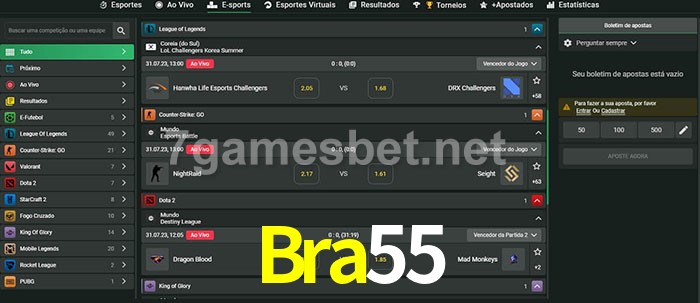 O Bra55 oferece uma grande seleção de opções de apostas em e-sports com probabilidades competitivas